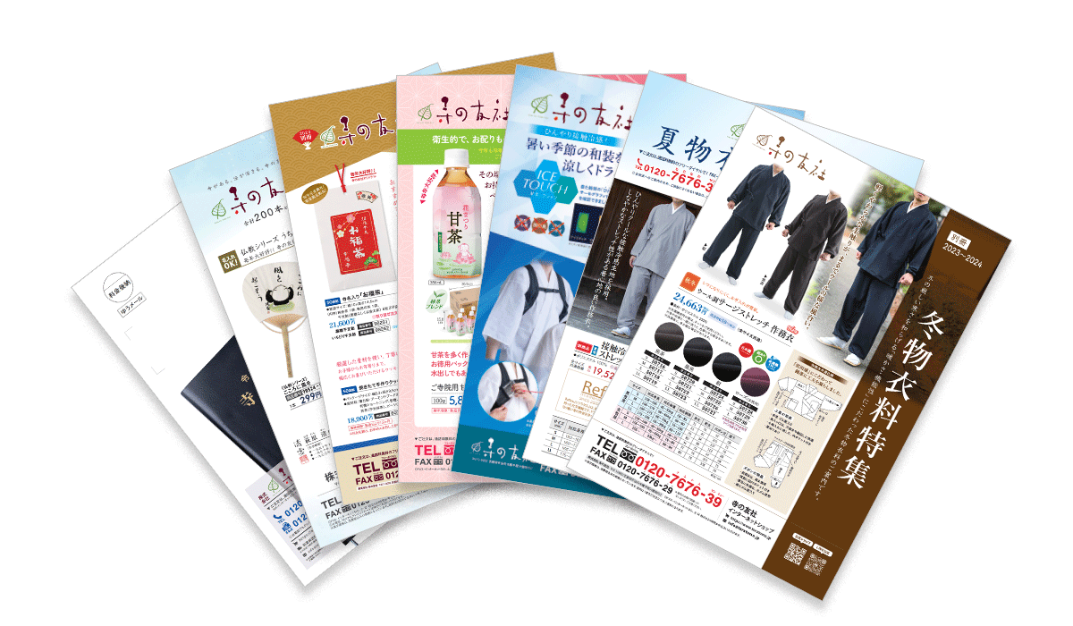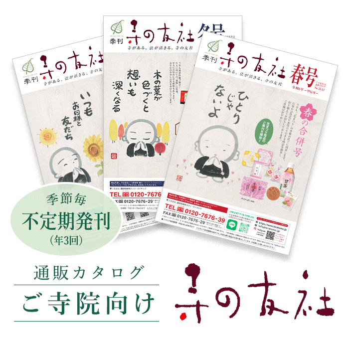 ご寺院様・ご神社様向けに、仏具、調度品、神社用品、衣料品(和装)などを取り揃えた通信販売カタログを、定期発行しています。電話・ハガキ・FAXでのご注文を承っております。(一般のお客様へのお届けはしておりません)