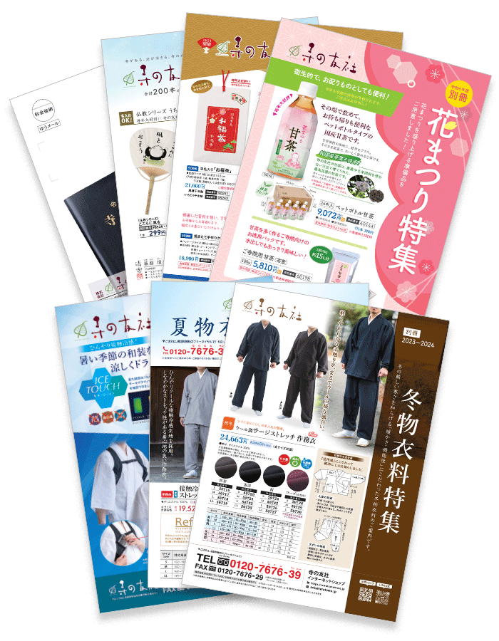 ご寺院様・ご神社様向けに、季節の行事用品、授与品のパンフレットをダイレクトメールでお届けしています。仏事、神事の準備にご活用ください。